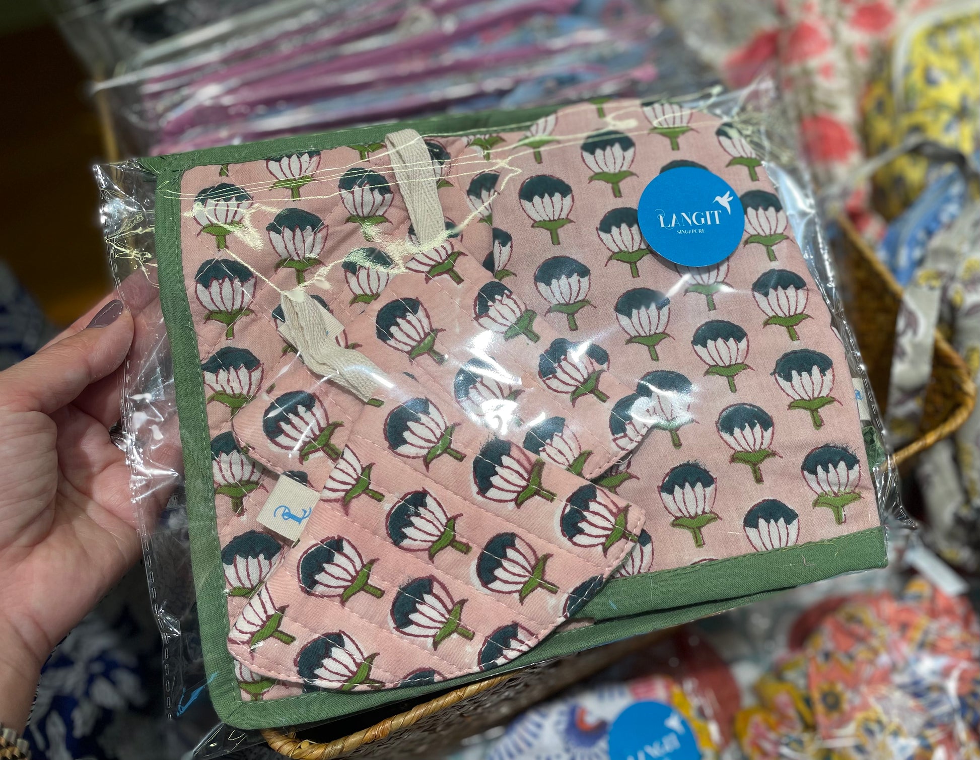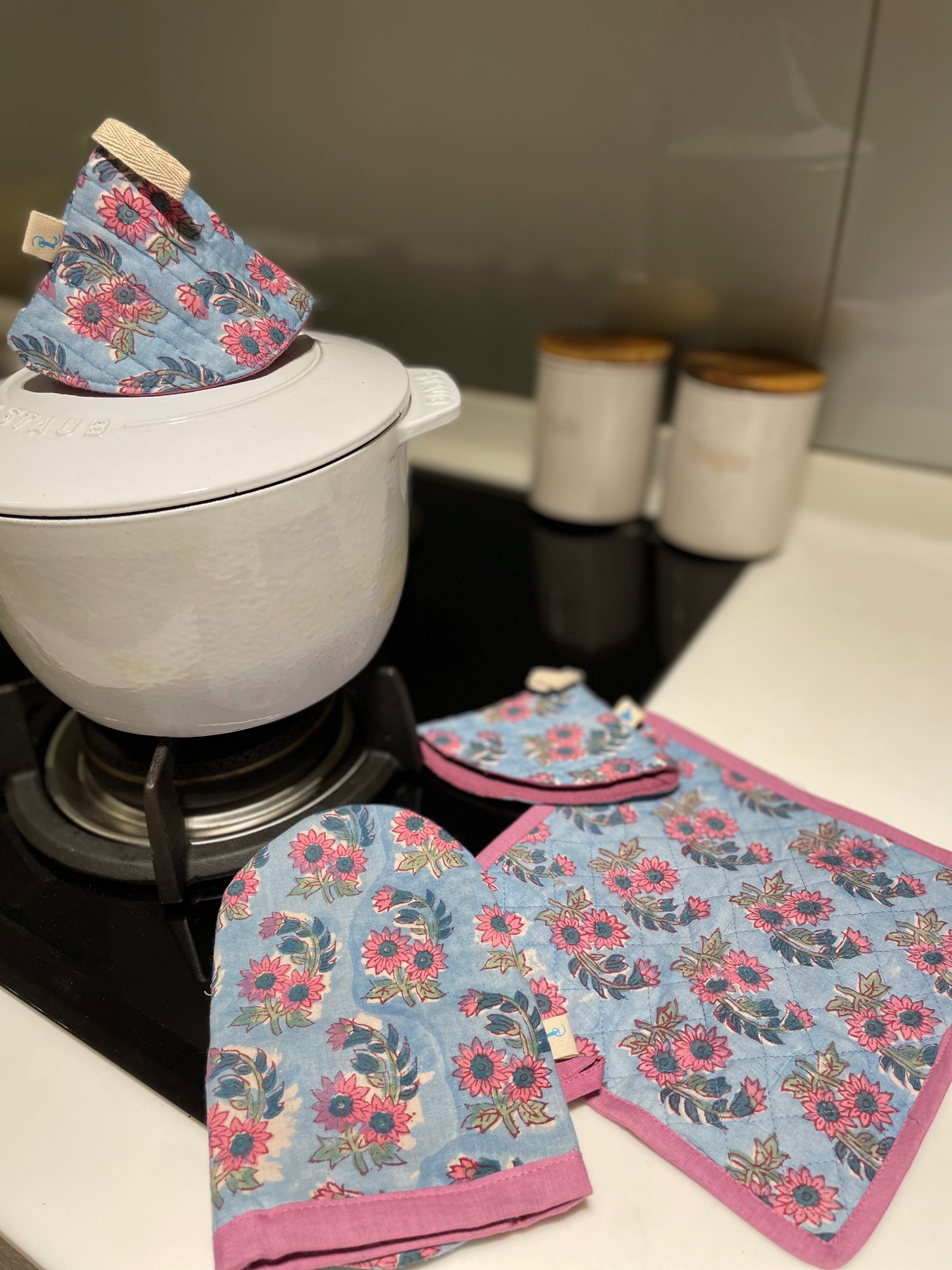 鍋敷き、鍋つまみ(2点)、ミトンのセット販売となります。